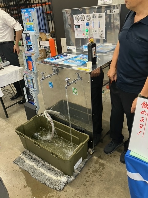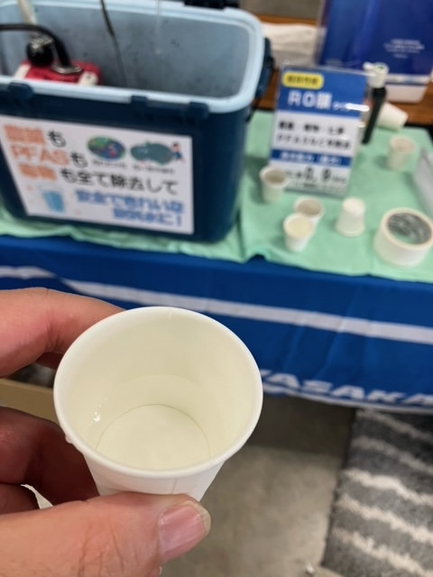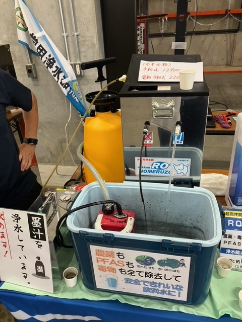 展示会内では、水に墨汁を混ぜて真っ黒になった水をこの浄水器でろ過し、飲料水として提供するというデモンストレーションを行っていました